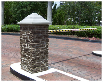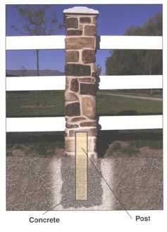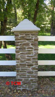 Rock Pillar Installation Instructions: Pre-formed faux pillars are designed to enhance existing fences and new installations. Pillars can be buried for shorter applications. When setting elevation, it is important to establish the height by the finished concrete elevation in the initial hole. The Rock Post is slid over the pre-installed 4×4 or 5×5 post and secured into place by putting additional concrete or gravel inside the Rock Post. For corner posts, gate post, mailbox, or signs, the entire Rock Post may be filled with concrete. Cutting the Rock Post for vinyl, split rail, log, etc. is simple!! By using a hole saw, router, or jigsaw, holes can be cut through the 1/4″ wall to receive any configuration. The simulated concrete cap is removable and is designed to accept different lighting applications.