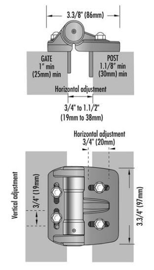 With up to 1 1/2″ (38mm) of horizontal adjustment and 3/4″ (19mm) of vertical adjustment, they are suitable for installation on any type of gate material.